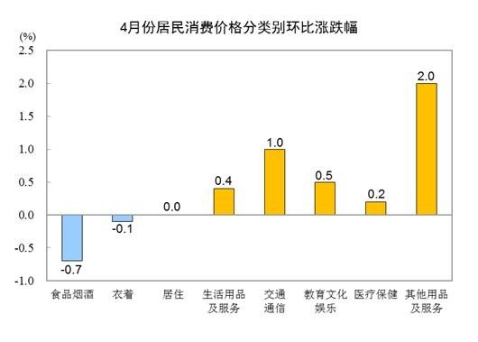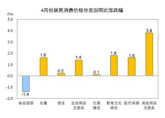 (圖片源自於中國國家統計局網站,下同) 一、各類商品及服務價格同比變動情況 4月份,食品煙酒類價格同比下降1.4%,影響CPI(居民消費價格指數)下降約0.39個百分點。食品中,蛋類價格下降10.6%,影響CPI下降約0.07個百分點;鮮果價格下降9.7%,影響CPI下降約0.22個百分點;畜肉類價格下降3.2%,影響CPI下降約0.10個百分點,其中豬肉價格上漲1.4%,影響CPI上漲約0.02個百分點;鮮菜價格上漲1.3%,影響CPI上漲約0.03個百分點;糧食價格上漲0.5%,影響CPI上漲約0.01個百分點。 其他七大類價格同比均上漲。其中,其他用品及服務、教育文化娛樂價格分別上漲3.8%和1.8%,衣著、醫療保健價格均上漲1.6%,生活用品及服務、居住、交通通信價格分別上漲1.4%、0.2%和0.1%。