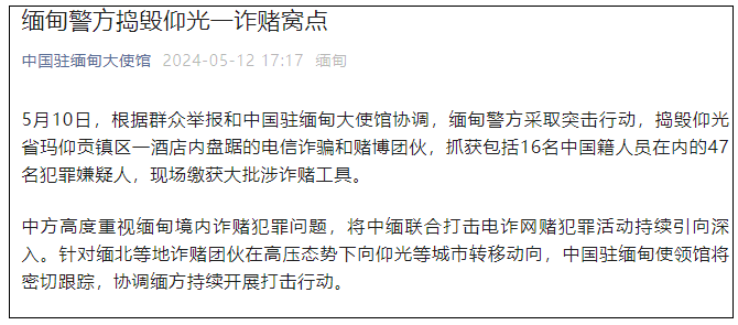 香港新聞網5月13日電 微信公眾號“中國駐緬甸大使館”5月12日消息,5月10日,根據群眾舉報和中國駐緬甸大使館協調,緬甸警方採取突擊行動,搗毀仰光省瑪仰貢鎮區一酒店內盤踞的電信詐騙和賭博團夥,抓獲包括16名中國籍人員在內的47名犯罪嫌疑人,現場繳獲大批涉詐賭工具。 中方高度重視緬甸境內詐賭犯罪問題,將中緬聯合打擊電詐網賭犯罪活動持續引向深入。針對緬北等地詐賭團夥在高壓態勢下向仰光等城市轉移動向,中國駐緬甸使領館將密切跟蹤,協調緬方持續開展打擊行動。