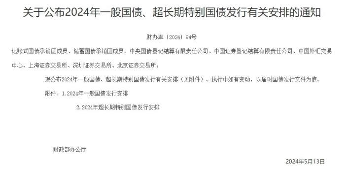 香港新聞網5月13日電 13日,中國財政部官網發佈關於公佈2024年一般國債、超長期特別國債發行有關安排的通知。