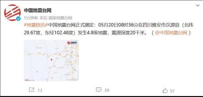 香港新聞網5月27日電 中國地震台網正式測定:05月27日11時07分在四川涼山州木里縣(北緯28.25度,東經100.70度)發生5.0級地震,震源深度8千米。
