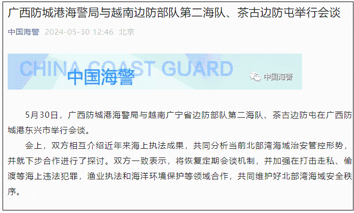 香港新聞網5月30日電 微信公眾號“中國海警”消息,5月30日,廣西防城港海警局與越南廣寧省邊防部隊第二海隊、茶古邊防屯在廣西防城港東興市舉行會談。