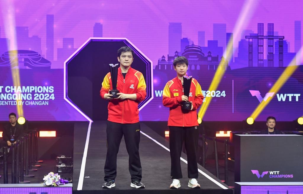 6月3日,男單冠軍中國選手樊振東(左)與女單冠軍中國選手孫穎莎在頒獎儀式上合影。新華社記者 張子彧 攝