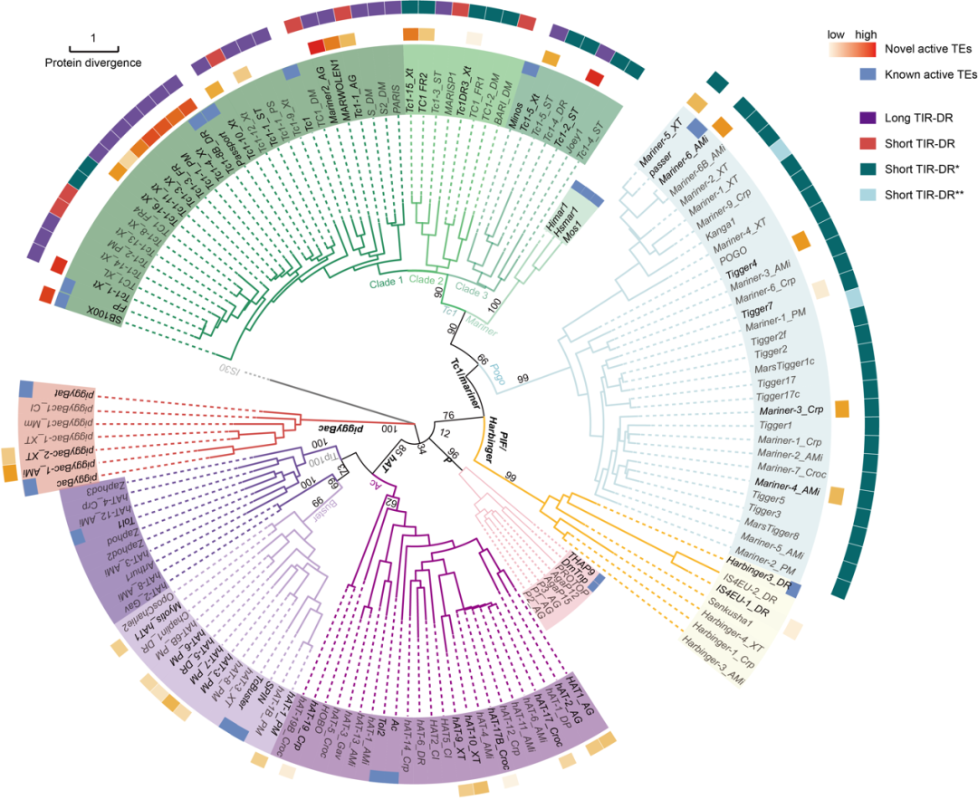 130個新型DNA轉座子和20個已知活躍DNA轉座子的進化樹。(圖片來源:中國科學院動物研究所) DNA轉座子約佔人類基因組的2%,是一種天然的可以自主移動的DNA序列,可以演化為功能性基因或調控元件。DNA轉座子跳躍是物種進化的重要動力,有助於宿主適應惡劣環境。(完) 【編輯:丘志彬】