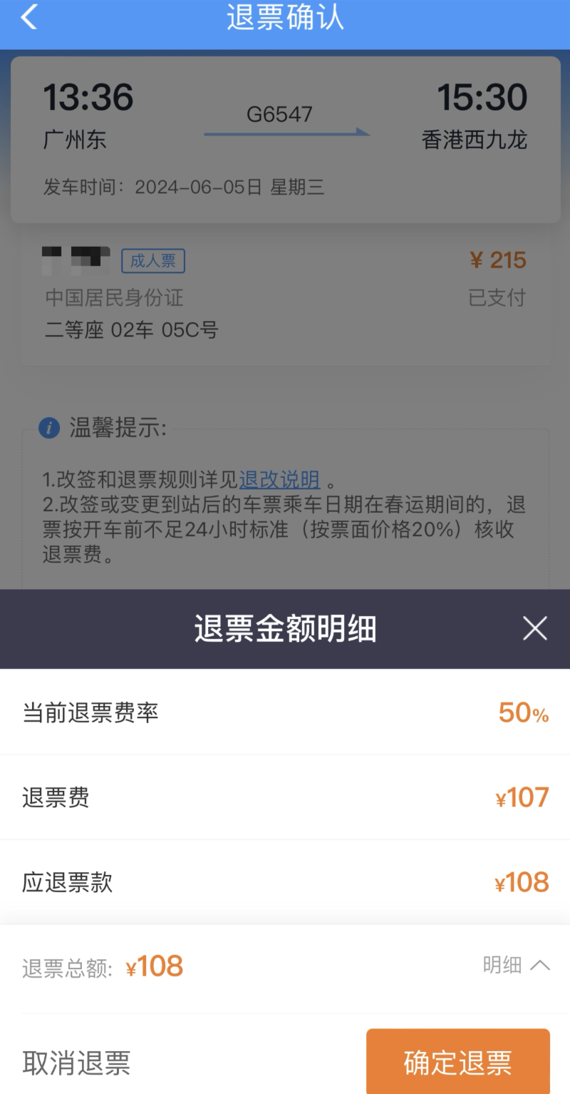 汪女士提前42小時退票被收取50%退票費率 汪女士她告訴記者,由於工作原因,她經常在鐵路12306 App上購買高鐵票,對退票規則也非常清楚,普通高鐵票退票少於24小時的,是收取20%退票費,在48小時之外的,只收取5%。 汪女士認為,廣州前往香港的高鐵票在購票時與普通高鐵票流程一樣,沒有關於退費費率不同的提示,這會導致消費者在不了解高額退費規則的情況下購票,造成經濟損失,“買票界面是一樣的,我以為和普通高鐵票規則也是一樣的,甚至在退票頁面的溫馨提示上還顯示‘春運期間退票按開車前不足24小時標準(按票面價格20%)核收退票費’”。 汪女士稱,這趟列車的車票一直富餘,如果在購票的時候知道該趟列車特殊、退票費高,自己可能就不會選擇提前買票。