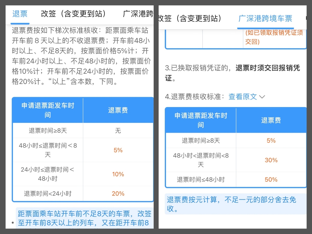 高鐵退票規則與廣深港跨境車票退票規則對比 據了解,廣州前往香港的高鐵票被稱為“廣深港跨境車票”,但通過鐵路12306 App預訂時,該車票并未進行特殊標誌,預訂界面與流程與高鐵票一致。在確認訂單頁面的“溫馨提示”中,也未告知該車票退費規則不同。 在《退改說明》中,高鐵票的退票費分為4檔,其中退票時間距離發車時間<48小時,收取退票費10%。而“廣深港跨境車票”的退票費只有3檔,退票時間距離發車時間≤48小時,收取退票費50%。 記者注意到,在社交平台上也有不少消費者反映“廣深港跨境車票”退票費不合理,其中多數消費者表示對該趟列車退改規則的變化不知情。 對此,6月13日,中國鐵路廣州局集團有限公司的工作人員表示,廣州直通香港西九龍的列車屬於跨境列車,目前由港鐵公司負責運營,因此退改規則也由港鐵公司制定,與內地其他車次不同。 對於為何在購票時沒有退改規則提示?該工作人員稱,由於購票頁面顯示的內容較多,無法一一提示,但在確定訂單的頁面右上角有“退改說明”的標注,點擊進入即可查看該列車的退改規則,“建議用戶在購票前都查看清楚,以免造成經濟損失”。(完) 【編輯:丘志彬】