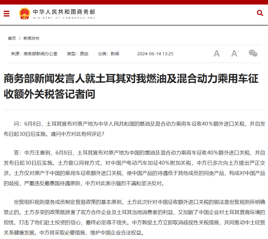 中國商務部網站截圖 問:6月8日,土耳其宣佈對原產地為中華人民共和國的燃油及混合動力乘用車征收40%額外進口關稅,并自發佈日起30日後實施。請問中方對此有何評論? 答:中方注意到,6月8日,土耳其宣佈對原產地為中國的燃油及混合動力乘用車征收40%額外進口關稅,并自發佈日起30日後實施。土方曾以同樣方式,對中國產電動汽車加征40%附加關稅,中方已多次向土方提出嚴正交涉。土方僅對原產於中國的乘用車征收額外進口關稅,使中國產品的待遇低於其他成員的同類產品,構成對中國產品的歧視,嚴重違反最惠國待遇原則,中方對此表示強烈不滿和堅決反對。 世貿組織規則是各成員制定貿易政策的基本原則。土方此次針對中國征收額外進口關稅的做法是世貿規則所明確禁止的。土方多變的政策既損害了雙方合作企業及土耳其當地消費者的利益,又加劇了中國企業對土耳其營商環境的擔憂、打擊了他們赴土投資的信心,最終必定得不償失。中方敦促土方立即取消歧視性關稅措施,共同推動中土經貿關係健康發展。中方將採取必要措施,維護中國企業合法權益。(完) 【編輯:丘志彬】