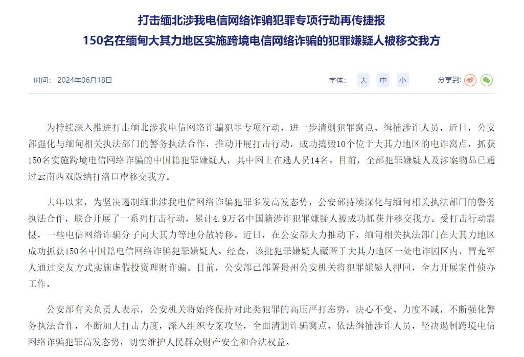 目前,全部犯罪嫌疑人及涉案物品已通過雲南西雙版納打洛口岸移交中方。(圖片來源:中國公安部官網截圖) 去年以來,為堅決遏制緬北涉我電信網絡詐騙犯罪多發高發態勢,公安部持續深化與緬甸相關執法部門的警務執法合作,聯合開展了一系列打擊行動,累計4.9萬名中國籍涉詐犯罪嫌疑人被成功抓獲並移交中方。受打擊行動震懾,一些電信網絡詐騙分子向大其力等地分散轉移。近日,在公安部大力推動下,緬甸相關執法部門在大其力地區成功抓獲150名中國籍電信網絡詐騙犯罪嫌疑人。經查,該批犯罪嫌疑人藏匿於大其力地區一處電詐園區內,冒充軍人通過交友方式實施虛假投資理財詐騙。目前,公安部已部署貴州公安機關將犯罪嫌疑人押回,全力開展案件偵辦工作。 公安部有關負責人表示,公安機關將始終保持對此類犯罪的高壓嚴打態勢,決心不變、力度不減,不斷強化警務執法合作,不斷加大打擊力度,深入組織專案攻堅,全面清剿詐騙窩點,依法緝捕涉詐人員,堅決遏制跨境電信網絡詐騙犯罪高發態勢,切實維護人民群眾財產安全和合法權益。(完) 【編輯:丘志彬】