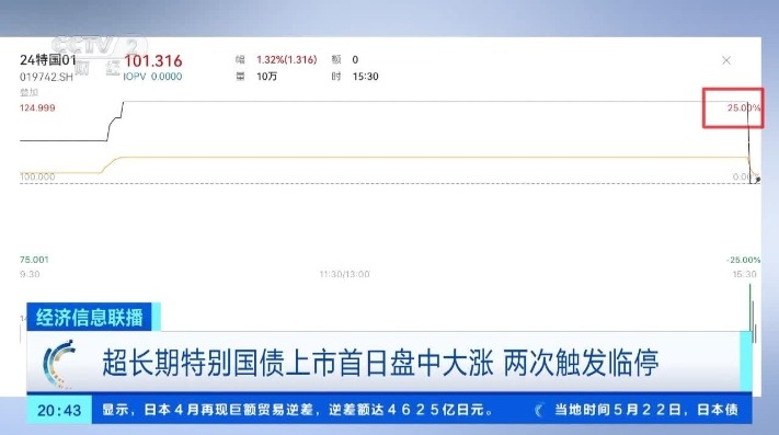 大公國際首席分析師 霍霄:超長期特別國債價格波動可能受到多種因素的影響,如央行政策、經濟周期、外部金融環境變化等。通貨膨脹也是不可忽視的因素,可能導致投資者的實際收益率下降。 20年期超長期特別國債今天第一次續發行 50年期超長期特別國債今天上市,2024年20年期超長期特別國債也在今天(19日)第一次續發行,發行規模達到450億元。超長期特別國債的發行分為“首發”和“續發”,像今天續發行的20年期超長期特別國債,在5月24日已首發400億元,7月—11月期間還將發行5次。 本次續發行國債為20年期固定利率附息債,發行總額450億元,票面利率2.49%,將通過財政部北京證券交易所政府債券發行系統進行招標發行。這次續發行的國債從2024年5月25日開始計息,按半年付息,每年5月25日、11月25日支付利息,2044年5月25日償還本金并支付最後一次利息。 根據安排,本次續發行國債在6月24日起與之前發行的同期國債合併上市交易。(完) 【編輯:丘志彬】