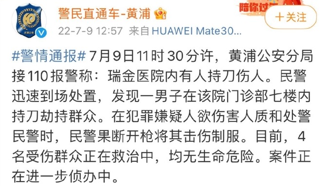 香港新聞網6月19日電  據上海市公安局城市軌道和公交總隊官方微博“軌交么么零”通報:北京時間6月19日8時28分,軌交9號線合川路站內發生一起持刀傷人案件。