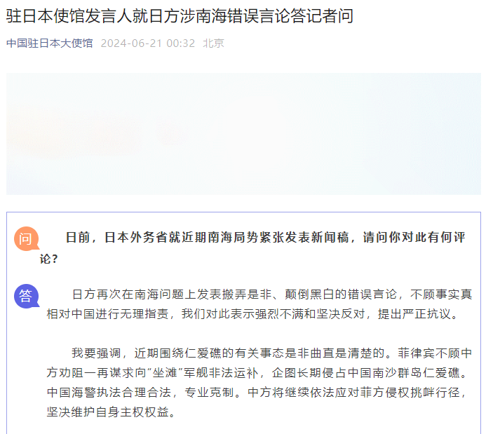 香港新聞網6月21日電 據中國駐日本大使館微信公眾號21日消息,使館發言人就日方涉南海錯誤言論答記者問。