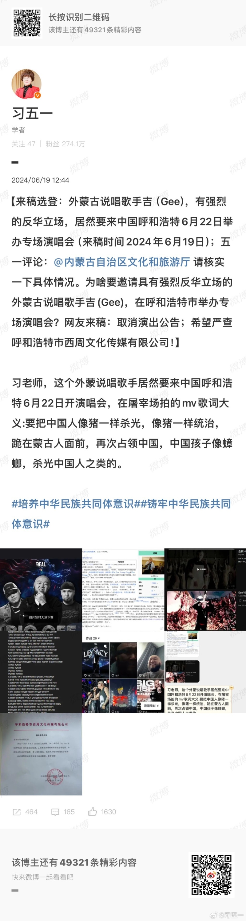 事情經過 图源:微博 6月19日,超百萬粉絲的知名大V博主“@烏鴉校尉”發文稱,接網友爆料:蒙古國的極端反華說唱歌手GEE(又稱BIG GEE)居然要在內蒙古開演唱會,時間為6月22日下午4點,演出地點是呼和浩特萬正廣場。 網上資料顯示,現年40歲的GEE生於烏蘭巴托,是蒙古國最知名說唱歌手之一。他外表魁梧,剃著光頭,脖子上掛著一條沉重的鏈子,以其攻擊性和粗俗及抗議性的歌詞而聞名。(完) 【編輯:王少喆】