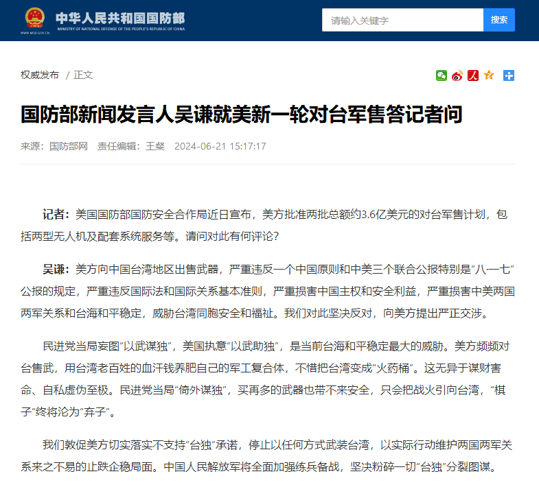 中國國防部網站截圖 據“國防部發布 ”消息,吳謙說,美方向中國台灣地區出售武器,嚴重違反一個中國原則和中美三個聯合公報特別是“八·一七”公報的規定,嚴重違反國際法和國際關係基本準則,嚴重損害中國主權和安全利益,嚴重損害中美兩國兩軍關係和台海和平穩定,威脅台灣同胞安全和福祉。中方對此堅決反對,向美方提出嚴正交涉。 吳謙表示,民進黨當局妄圖“以武謀獨”,美國執意“以武助獨”,是當前台海和平穩定最大的威脅。美方頻頻對台售武,用台灣老百姓的血汗錢養肥自己的軍工複合體,不惜把台灣變成“火藥桶”。這無異於謀財害命、自私虛偽至極。民進黨當局“倚外謀獨”,買再多的武器也帶不來安全,只會把戰火引向台灣,“棋子”終將淪為“棄子”。 吳謙說,中方敦促美方切實落實不支持“台獨”承諾,停止以任何方式武裝台灣,以實際行動維護兩國兩軍關係來之不易的止跌企穩局面。中國人民解放軍將全面加強練兵備戰,堅決粉碎一切“台獨”分裂圖謀。(完) 【編輯:丘志彬】
