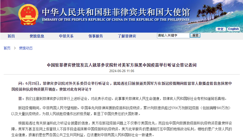中國駐菲大使館網站截圖 發言人介紹,新冠疫情期間,中菲兩國人民守望相助。中國率先向菲援助疫苗和抗疫物資,累計向菲提供超過5700萬劑新冠疫苗(包括捐贈500萬劑)以及大量抗疫物資,為菲人民戰勝疫情作出積極貢獻,彰顯了中國負責任的大國形象。 發言人指出,根據路透社有關報道和此次聽證會披露的信息,美方在新冠疫苗問題上不僅奉行美國優先,而且給中國向菲援助疫苗和抗疫物資惡意使絆設障,美軍方甚至在網上假冒菲人不擇手段造謠抹黑中國疫苗和抗疫物資。美方此舉服務的是遏制打壓中國的地緣政治私利,犧牲的是廣大菲人民的生命健康,損害的是世界各國公共衛生共同利益,應該遭到中菲兩國人民和國際社會一致譴責。(完) 【編輯:丘志彬】