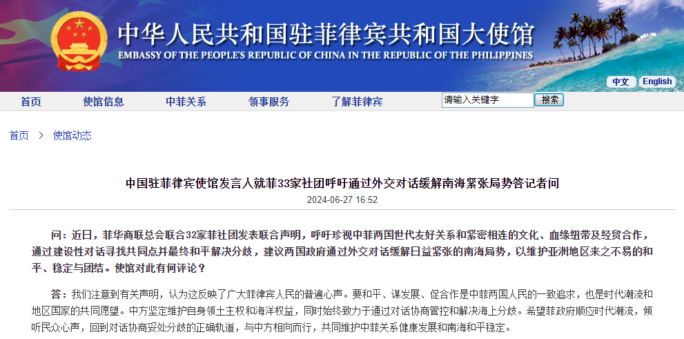 香港新聞網6月28日電 據中國駐菲律賓大使館網站6月27日消息,中國駐菲律賓使館發言人就菲33家社團呼籲通過外交對話緩解南海緊張局勢答記者問。