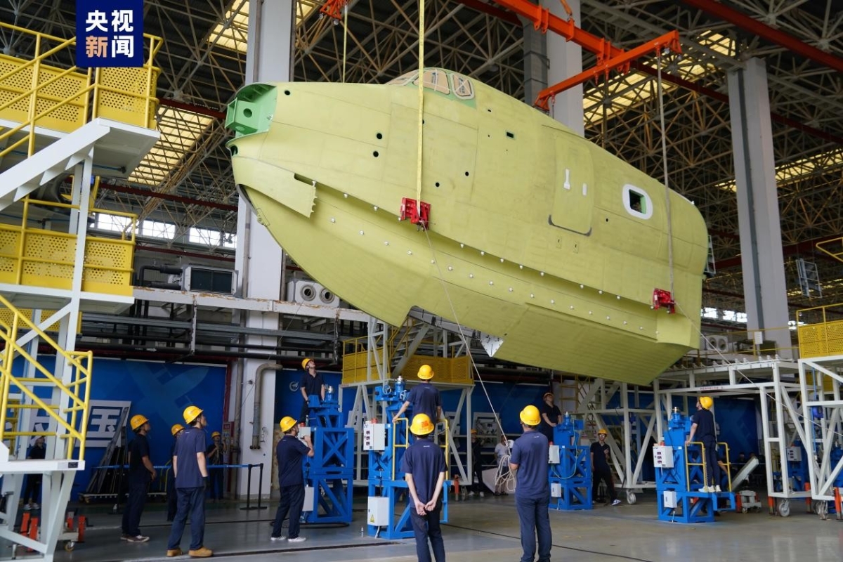 中國自研水陸兩棲飛機AG600批產首架機機頭大部件交付分享到: