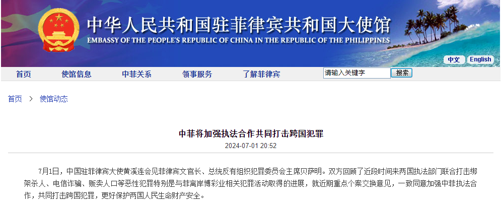 中國駐菲律賓大使館網站截圖 香港中通社報道,近日,網傳有兩名中國醫療器械公司高管赴菲律賓工作時,遭遇綁架並被撕票。據中國媒體7月1日報道,網傳信息屬實,一名遇害者前同事和知情人士確認了信息真實性。 網傳信息稱,兩位遇害人是中國國內兩家醫療器械公司的管理層人員,為了在海外拓展業務,兩個人相約去了菲律賓考察,結果6月20日一下飛機,就被綁匪綁架,慘遭綁匪4天折磨後,6月24日遇害。 目前警方已經介入調查,警方暫未透露案情進展情況。 7月1日,一名遇害者家屬接受媒體採訪時稱,當日上午已在北京舉行追悼會,目前正帶骨灰回老家安葬,公司已給予家屬相應幫助,相關善後工作正在進行。 近年來,菲律賓已發生多起針對中國人的綁架案。2024年6月,包括3名中國公民在內的4人在馬尼拉遭遇綁架勒索後被釋放。據報道,目前部分犯罪嫌疑人已被捕,有當地執法人員涉案,案件正在進一步調查中。 2023年10月,在菲律賓馬尼拉大都會區南部一個高檔別墅社區發生的一起持槍綁架案中,6名中國人被綁架,其中4人被撕票,2人下落不明。2023年12月,該案兩名嫌犯落網,他們的身份為商人和保安,被指控綁架勒索、嚴重非法拘留和謀殺罪。(完) 【編輯:丘志彬】