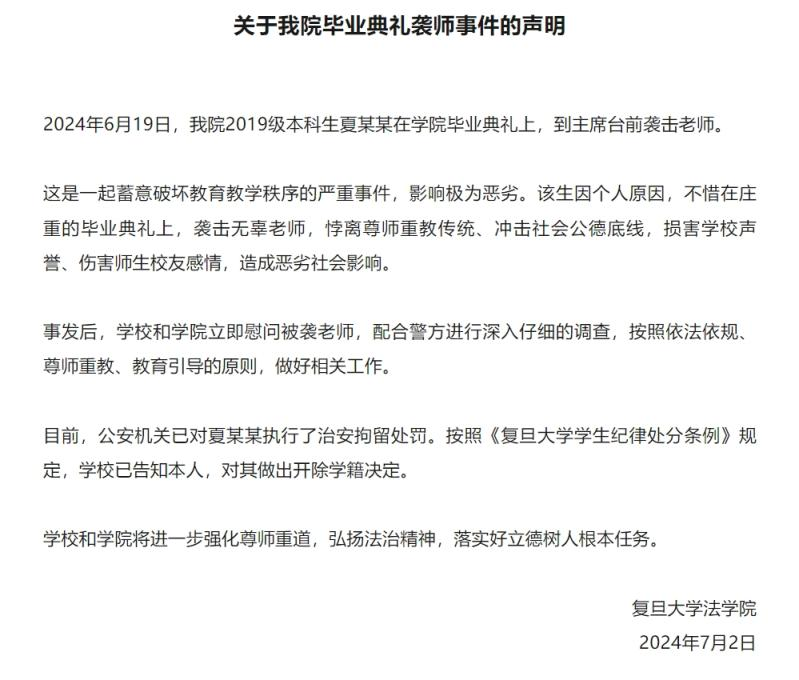 香港新聞網7月2日電 據“復旦大學法學院”微信公號消息,7月2日,復旦大學法學院發佈關於該院畢業典禮襲師事件的聲明。全文如下: 2024年6月19日,我院2019級本科生夏某某在學院畢業典禮上,到主席台前襲擊老師。 這是一起蓄意破壞教育教學秩序的嚴重事件,影響極為惡劣。該生因個人原因,不惜在莊重的畢業典禮上,襲擊無辜老師,悖離尊師重教傳統、衝擊社會公德底線,損害學校聲譽、傷害師生校友感情,造成惡劣社會影響。 事發後,學校和學院立即慰問被襲老師,配合警方進行深入仔細的調查,按照依法依規、尊師重教、教育引導的原則,做好相關工作。 目前,公安機關已對夏某某執行了治安拘留處罰。按照《復旦大學學生紀律處分條例》規定,學校已告知本人,對其做出開除學籍決定。 學校和學院將進一步強化尊師重道,弘揚法治精神,落實好立德樹人根本任務。