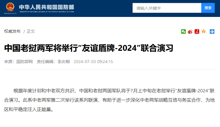 中國老撾兩軍將舉行“友誼盾牌-2024”聯合演習