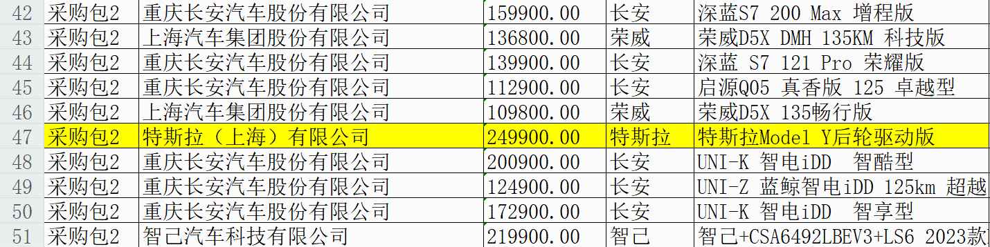 部分入圍供應商名單截圖 多家內地財經媒體報道稱,這是中國首例特斯拉進入政府採購目錄的案例。 根據公示信息,最新一批的採購入圍名單還包括問界M7、阿維塔11、深藍SL03、深藍S7、智己LS6、智己L7、銀河L6、銀河E8行政版、幾何E、幾何G6、長安UNI-K/Z、啟源A07、啟源Q05、榮威D5X、沃爾沃XC40、曹操60等車型。(完) 【編輯:丘志彬】