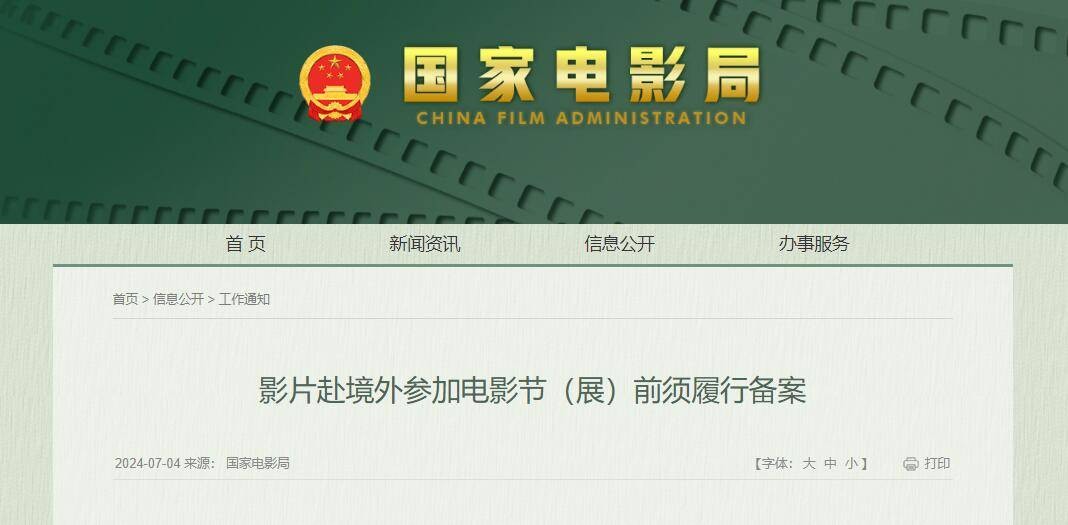 中國國家電影局網站截圖 備案遵循屬地原則,影片在立項的省級電影主管部門備案。在國家電影局直接立項的影片,向國家電影局備案。 備案主體應在節(展)舉辦二十個工作日前報送備案材料:加蓋申請單位公章的備案申請(包括:電影節展名稱中英文、時間、地點,電影出品單位聯繫人、聯繫電話)、影片公映許可證複印件。 短片參加境外電影節展參照執行,由境內第一出品單位或送展法人向國家電影局備案。(完) 【編輯:丘志彬】