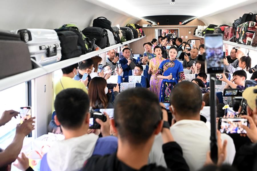 北京時間2023年4月13日,中老鐵路國際旅客列車正式開行。 香港中通社圖片 2023年4月13日,中老鐵路國際旅客列車正式開行。一年多來,該列車歷經2次停靠時間壓縮和2次票額增加。停靠時間由最開始的90分鐘壓縮至現在的52分鐘;票額數量由250張增加至350張;出入境人數從最初每日300人次左右,增長到700人次左右;出入境人員從最初的來自27個國家和地區迅速增長到96個國家和地區。 “泰國曼谷到老撾萬象的跨國列車即將開通,這樣只需換乘一次就可以到中國旅游了。”5日,在第二次入境中國時,泰國籍旅客Jaichuen Prathumwad高興地說。 中老鐵路有着開放時間長、客貨流量大、通關需求多等特點。磨憨邊檢站根據列車載運情況,制訂專項勤務方案,分類查驗國際客運列車及貨運列車,細化崗位流程及時增派警力,充分發揮旅客預錄預檢等功能。目前,列車準點率及一般旅客驗放率均達100%。(完) 【編輯:丘志彬】