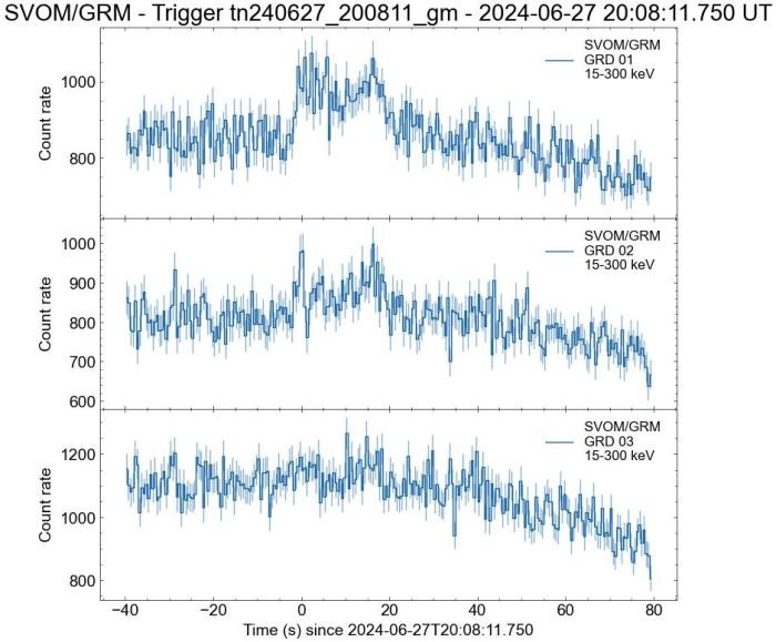 中法天文衛星伽馬射線監測器載荷三台探測器捕捉到的首個伽馬暴GRB240627B的光變曲線。中國科學院微小衛星創新研究院/供圖 經過比對,該伽馬暴的光變曲線與中國創新X首發星上所搭載的“極目”空間望遠鏡(GECAM-C)觀測到的結果相同,也和國際上費米衛星探測器的觀測結果高度一致。 隨後,伽馬射線監測器又先後於6月29日、7月2日成功探測到第二個伽馬暴(編號GRB240629A)和第三個伽馬暴(編號GRB240702A)。其首批探測到的3個伽馬暴結果已提交至國際通用協同網絡,這不僅充分驗證了中法天文衛星伽馬射線監測器載荷對伽馬暴的高精度觸發探測能力,也有助於幫助人類解決基礎科學中的若干重大問題。