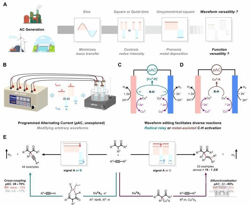 香港新聞網7月15日電 據中國武漢大學7月14日消息,該校高等研究院、化學與分子科學學院雷愛文教授團隊實現了交流電解環境下金屬催化物種精準調控,解決了電合成條件下過渡金屬催化劑容易在陰極析出失活而必須用分離池的科學難題。該研究成果近日以“程序化交流電優化銅催化C-H鍵轉化反應”為題在線發表在國際學術期刊《科學》上。 論文通訊作者雷愛文教授介紹,電合成化學新技術具備綠色、安全和低能耗等特性,有望解決化石能源利用過程中帶來的環境污染、安全生產風險和高能耗等問題。目前,這種新興合成技術主要以直流電作為驅動力,并通過調節電流或者電壓控制化學反應過程。相比之下,交流電具有極性反轉和周期性波動的特點,具備更多可調節電學參數,為改進電合成過程提供更多可能。 雷愛文介紹,研究團隊開發了一種可編程波形交流電合成技術(pAC),通過對交流電的相關電學參數進行程序編輯,可得到定製化的交流電信號,不同編輯模式的交流電信號不僅促進了電解條件下銅催化劑循環再生,還可分別精準調控銅催化劑形成“銅結合碳自由基物種”和“碳-銅活性物種”。研究團隊還觀測到不同交流電信號動態調控銅催化物種活性的變化規律。