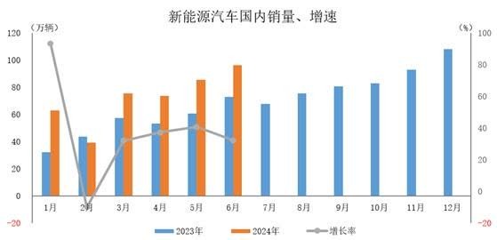 2024年6月,新能源汽車國內銷量96.3萬輛,環比增長12.5%,同比增長32.2%。 2024年1-6月,新能源汽車國內銷量433.9萬輛,同比增長35.1%。