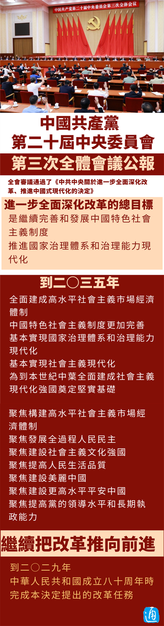 香港新聞網7月18日電 中國共產黨第二十屆中央委員會第三次全體會議於2024年7月15日至18日在北京舉行。全會指出,進一步全面深化改革的總目標是繼續完善和發展中國特色社會主義制度,推進國家治理體系和治理能力現代化。到2035年基本實現社會主義現代化,詳情戳圖↓