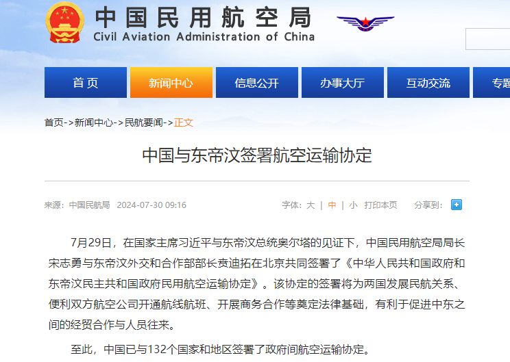 香港新聞網7月30日電 據中國民航局網站消息,7月29日,中國民用航空局局長宋志勇與東帝汶外交和合作部部長賁迪拓在北京共同簽署了《中華人民共和國政府和東帝汶民主共和國政府民用航空運輸協定》。該協定的簽署將為兩國發展民航關係、便利雙方航空公司開通航線航班、開展商務合作等奠定法律基礎,有利於促進中東之間的經貿合作與人員往來。