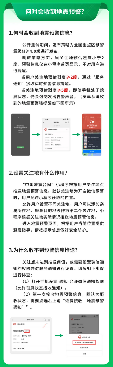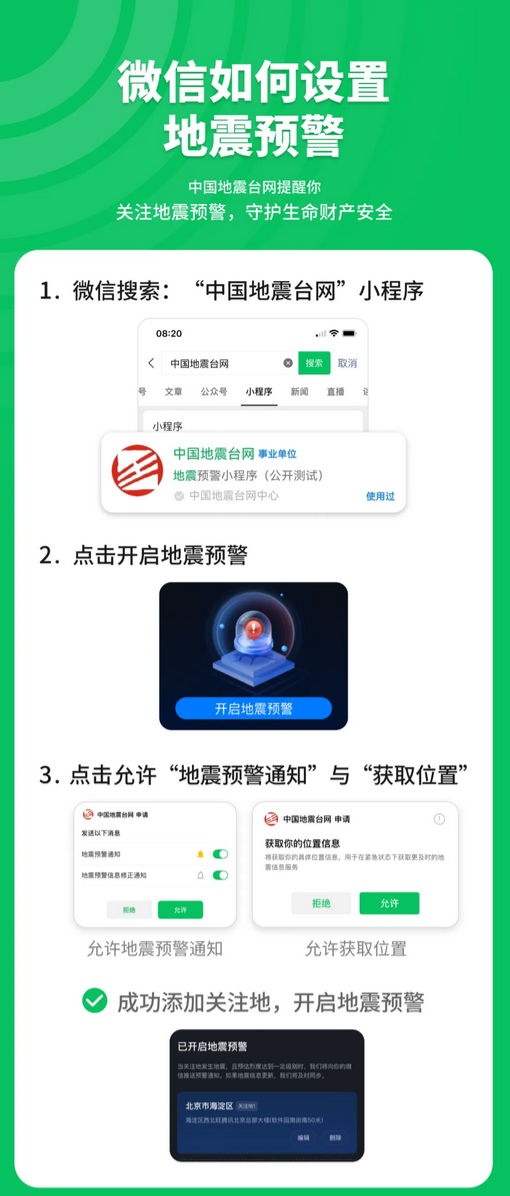 香港新聞網8月2日電 8月2日,在中國地震局指導下,中國地震台網中心、中央廣播電視總台國家應急廣播與騰訊聯合推出“中國地震台網”全國微信預警服務,面向公眾開展公開測試。江蘇、河北、海南、甘肅、廣東、陝西等各地也陸續上線了本地地震預警服務。全國微信用戶可通過小程序開啟地震預警。 即日起,用戶在微信內搜索“中國地震台網”或“地震預警”,進入“中國地震台網”小程序,點擊“開啟地震預警”并允許“地震預警通知”與“獲取位置”,成功添加關注地後即可開啟地震預警服務。 據介紹,無論大家使用哪種品牌、哪種型號的手機,通過小程序都將更加方便、快捷地接收到官方、權威的地震預警信息。 小程序實現了高併發量用戶秒級消息推送。當發生可能造成破壞性影響的地震時,小程序會發出強提醒警示,并提供國家應急廣播防震指南,持續提醒用戶及時採取避險措施,以降低地震災害影響。 此外,用戶還能通過小程序發出高頻音呼救,在被困情況下,向救援人員發出求救信號。不同影響程度的地震,對應不同的預警顔色和提示語,當地震影響較小時,僅在微信服務通知內提示,減少對用戶的打擾。