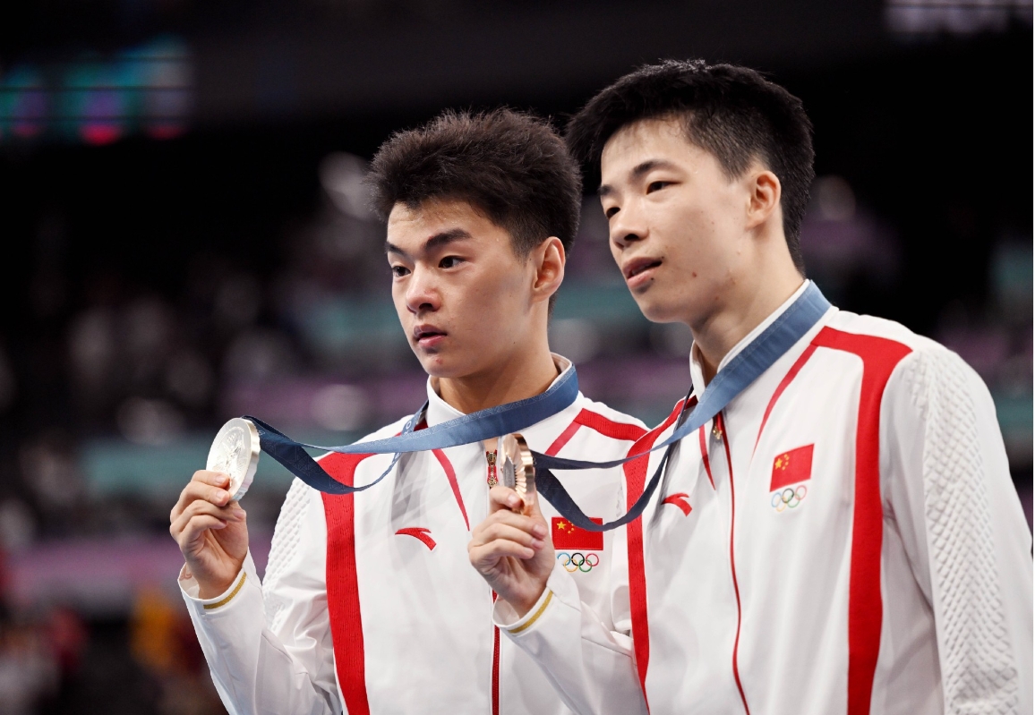 (巴黎奧運)中國選手王梓賽、嚴浪宇獲男子蹦床銀牌、銅牌
