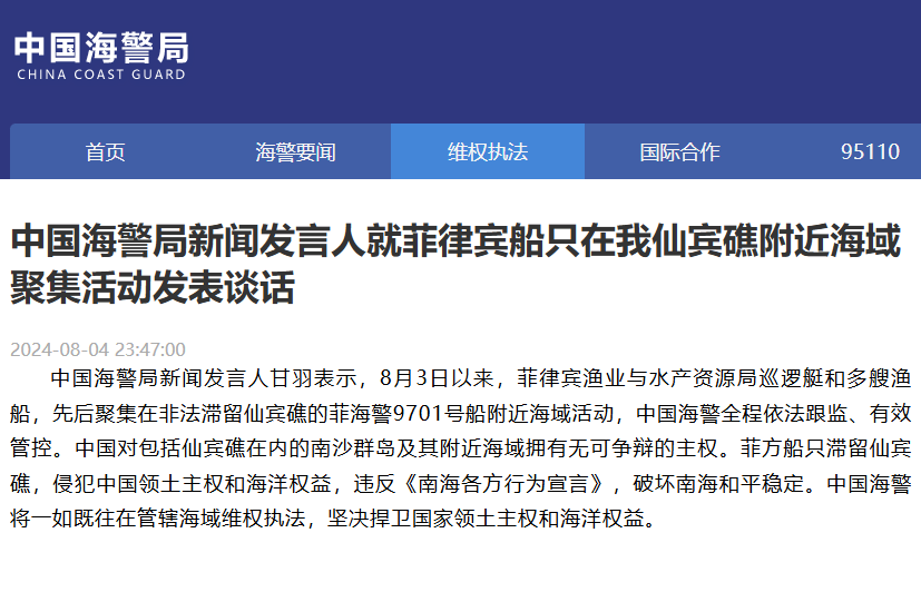 香港新聞網8月5日電 據中國海警局4日消息,中國海警局新聞發言人甘羽表示,8月3日以來,菲律賓漁業與水產資源局巡邏艇和多艘漁船,先後聚集在非法滯留仙賓礁的菲海警9701號船附近海域活動,中國海警全程依法跟監、有效管控。中國對包括仙賓礁在內的南沙群島及其附近海域擁有無可爭辯的主權。菲方船隻滯留仙賓礁,侵犯中國領土主權和海洋權益,違反《南海各方行為宣言》,破壞南海和平穩定。中國海警將一如既往在管轄海域維權執法,堅決捍衛國家領土主權和海洋權益。(完)