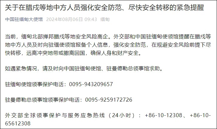 香港新聞網8月6日電 據微信公眾號“中國駐緬甸大使館”8月6日消息,當前,緬甸北部撣邦臘戍等地安全風險高企。外交部和中國駐緬甸使領館提醒在臘戍等地中方人員及時向駐緬使領館報備個人信息,強化安全防範,在規避安全風險前提下盡快轉移,遠離衝突地帶或撤離回國,確保人身和財產安全。 如遇緊急情況,請及時向中國駐緬甸使館、駐曼德勒總領事館求助。 駐緬甸使館領事保護電話:0095-943209657 駐曼德勒總領事館領事保護電話:0095-9259172726 外交部全球領事保護與服務應急熱線(24小時):+86-10-12308、+86-10-65612308