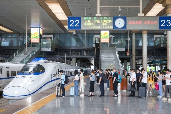 7月15日,旅客在南京南站乘坐G8389次高鐵列車。(新華社)