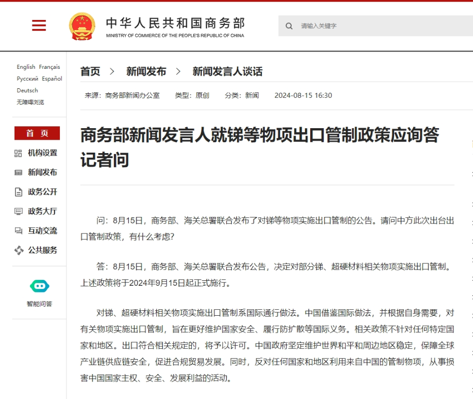 中國商務部官網截圖 商務部新聞發言人表示,對銻、超硬材料相關物項實施出口管制為國際通行做法。中國借鑒國際做法,並根據自身需要,對有關物項實施出口管制,旨在更好維護國家安全、履行防擴散等國際義務。相關政策不針對任何特定國家和地區。出口符合相關規定的,將予以許可。 發言人說,中國政府堅定維護世界和平和周邊地區穩定,保障全球產業鏈供應鏈安全,促進合規貿易發展。同時,反對任何國家和地區利用來自中國的管制物項,從事損害中國國家主權、安全、發展利益的活動。(完) 【編輯:彭玉婷】