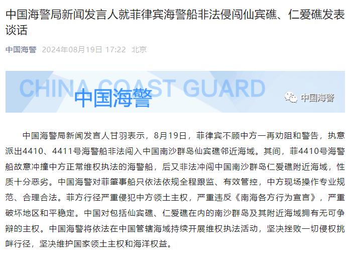 中國海警局新聞發言人甘羽表示,8月19日,菲律賓不顧中方一再勸阻和警告,執意派出4410、4411號海警船非法闖入中國南沙群島仙賓礁鄰近海域。其間,菲4410號海警船故意衝撞中方正常維權執法的海警船,後又非法衝闖中國南沙群島仁愛礁附近海域,性質十分惡劣。中國海警對菲肇事船隻依法依規全程跟監、有效管控,中方現場操作專業規範、合理合法。菲方行徑嚴重侵犯中方領土主權,嚴重違反《南海各方行為宣言》,嚴重破壞地區和平穩定。中國對包括仙賓礁、仁愛礁在內的南沙群島及其附近海域擁有無可爭辯的主權。中國海警將依法在中國管轄海域持續開展維權執法活動,堅決挫敗一切侵權挑釁行徑,堅決維護國家領土主權和海洋權益。(完) 【編輯:丘志彬】