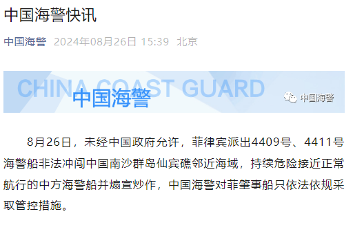 香港中通社8月26日電 中國海警局26日表示,當日,未經中國政府允許,菲律賓派出4409號、4411號海警船非法衝闖中國南沙群島仙賓礁鄰近海域,持續危險接近正常航行的中方海警船並煽宣炒作,中國海警對菲肇事船隻依法依規採取管控措施。