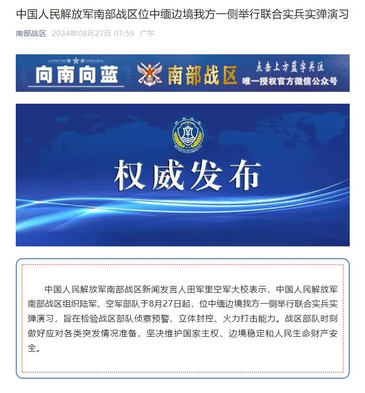 香港中通社8月27日電 中國人民解放軍南部戰區新聞發言人田軍里空軍大校27日表示,中國人民解放軍南部戰區組織陸軍、空軍部隊於當日起,位中緬邊境中方一側舉行聯合實兵實彈演習,旨在檢驗戰區部隊偵察預警、立體封控、火力打擊能力。 田軍里空軍大校說,南部戰區部隊時刻做好應對各類突發情況準備,堅決維護國家主權、邊境穩定和人民生命財產安全。