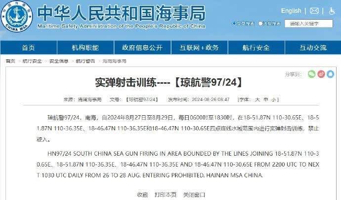 香港新聞網8月27日電 據中國海事局網站消息,清瀾海事局發布航行警告,8月27日至8月29日,每日6時至18時30分,南海部分海域進行實彈射擊訓練,禁止駛入。