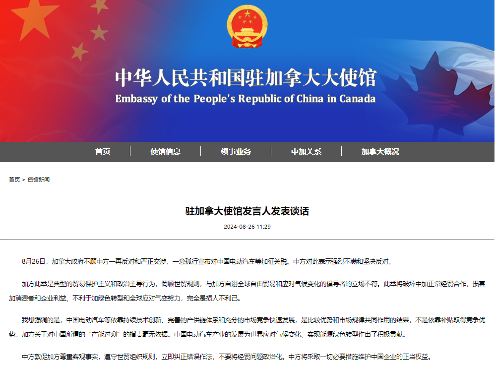 中國駐加拿大使館網站截圖 全文如下: 8月26日,加拿大政府不顧中方一再反對和嚴正交涉,一意孤行宣布對中國電動汽車等加征關稅。中方對此表示強烈不滿和堅決反對。 加方此舉是典型的貿易保護主義和政治主導行為,罔顧世貿規則,與加方自詡全球自由貿易和應對氣候變化的倡導者的立場不符。此舉將破壞中加正常經貿合作,損害加消費者和企業利益、不利於加綠色轉型和全球應對氣變努力,完全是損人不利己。 我想強調的是,中國電動汽車等依靠持續技術創新、完善的產供鏈體系和充分的市場競爭快速發展,是比較優勢和市場規律共同作用的結果,不是依靠補貼取得競爭優勢。加方關於對中國所謂的“產能過剩”的指責毫無依據。中國電動汽車產業的發展為世界應對氣候變化、實現能源綠色轉型作出了積極貢獻。 中方敦促加方尊重客觀事實,遵守世貿組織規則,立即糾正錯誤作法,不要將經貿問題政治化。中方將採取一切必要措施維護中國企業的正當權益。(完) 【編輯:丘志彬】