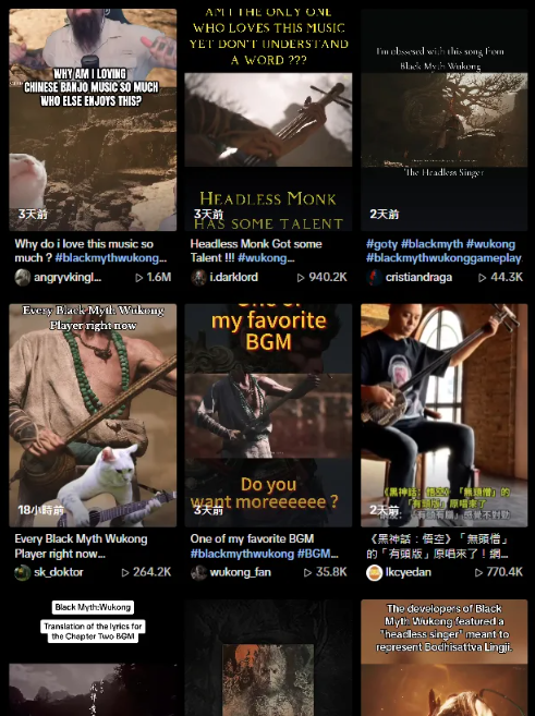 (圖源:TikTok) 很多海外遊戲博主更是沉浸在陝北說書畫面無法自拔。在這些博主發佈的reaction影片裡,可看到他們隨著音樂節奏搖擺,根本停不下來。 而“硬控”所有人的這段陝北說書,演繹者是陜北說書非物質文化遺產傳承人熊竹英。熊竹英接受採訪時稱,陜北說書的西北唱法、發音等自帶蒼涼屬性,和遊戲中無頭僧人的狀態相符。這次“破圈”也讓他非常高興,年輕人通過這種與遊戲融合創新的方式喜歡上陝北說書,期待未來有更多的年輕人學習並傳承這門技藝。 據了解,陝北說書是陝北地區傳統曲藝形式,曲調比較豐富,風格激揚粗獷,主要流行於延安、榆林等地,深受當地民眾喜愛,被稱為黃土高原上的“即興說唱”。表演者通常使用一把三弦樂器伴奏,以方言演唱長篇故事、民間傳說及鄉村生活。 【《黑神話》的神級配樂】 除了陝北說書火爆出圈,《黑神話:悟空》其他背景音樂,同樣吸引了大批玩家和音樂愛好者的關注。 比如帶著Rap節奏的《往生咒》。 《往生咒》原本是佛教淨土宗信徒經常持誦的一種咒語,也用作超度亡靈,遊戲中則將佛教誦經中的喉音演唱與電子音樂結合,被網友稱作“賽博誦經”。
