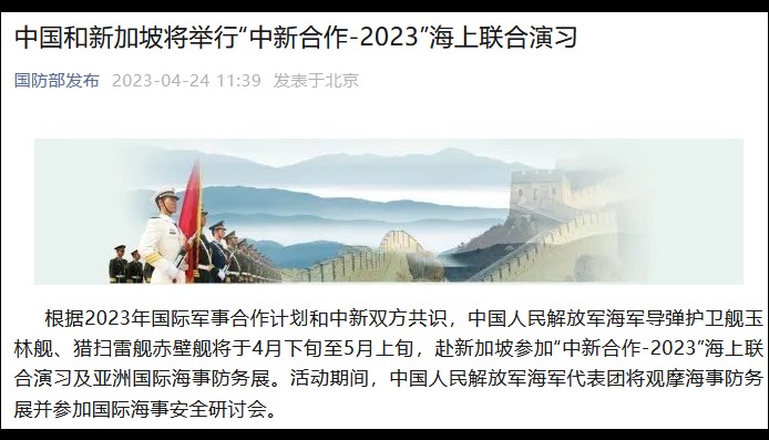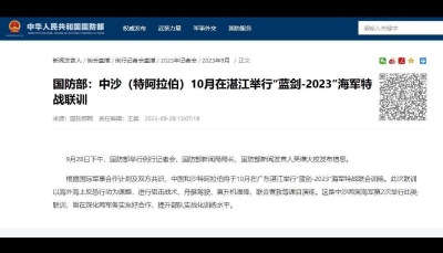 香港中通社8月29日電 中國國防部新聞發言人吳謙大校8月29日發布信息:根據年度計劃,中國與新加坡兩國軍隊將於8月30日至9月5日位中國廣東湛江及附近海空地域舉行“中新合作-2024”海上聯合演習。