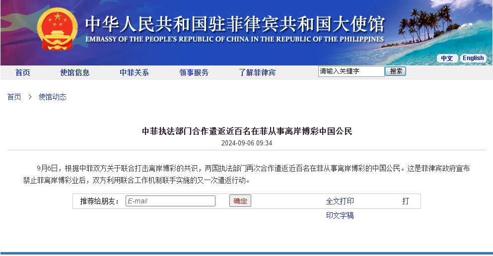 香港新聞網9月6日電 據中國駐菲律賓大使館網站消息,9月6日,根據中菲雙方關於聯合打擊離岸博彩的共識,兩國執法部門再次合作遣返近百名在菲從事離岸博彩的中國公民。這是菲律賓政府宣布禁止菲離岸博彩業後,雙方利用聯合工作機制聯手實施的又一次遣返行動。