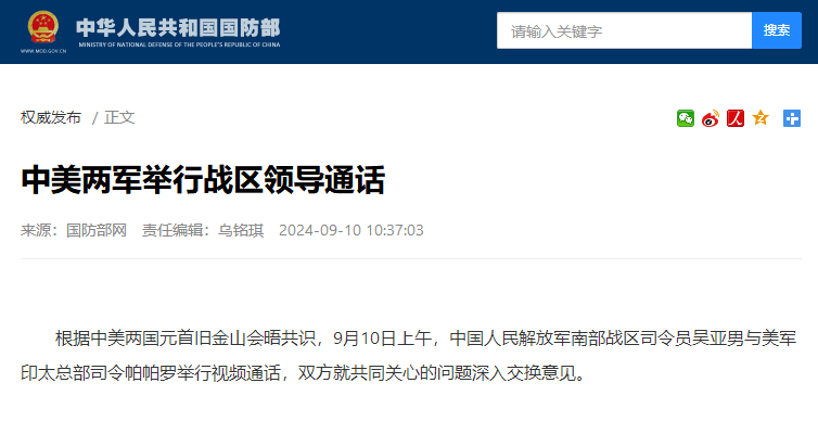 香港新聞網9月10日電 據中國國防部9月10日消息,根據中美兩國元首舊金山會晤共識,9月10日上午,中國人民解放軍南部戰區司令員吳亞男與美軍印太總部司令帕帕羅舉行視頻通話,雙方就共同關心的問題深入交換意見。