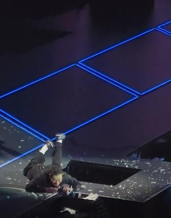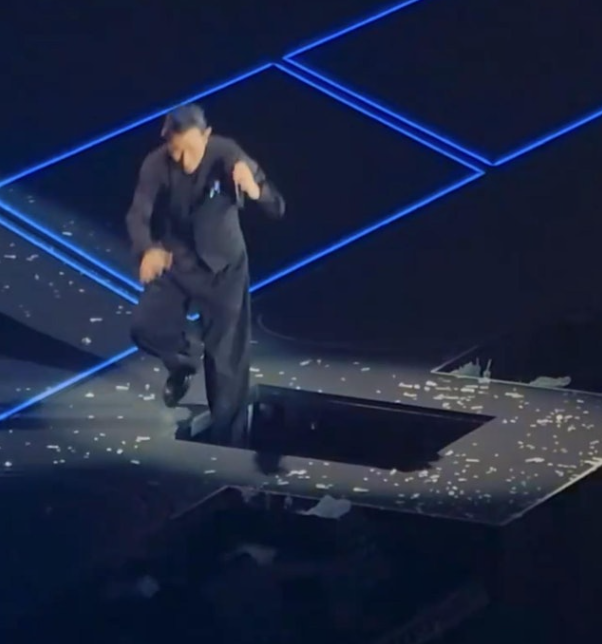 劉德華左腳踏空隨即墜下,網上視頻截圖。 有網民10日在社交平台上載了劉德華在唱《男人哭吧不是罪》一曲,網民寫下:“劉德華2024年深圳演唱會正面踩空跌倒影片。”劉德華一邊唱一邊在台上走著,突然間他踩到台上空出來的一格,差點摔到跌到台底。