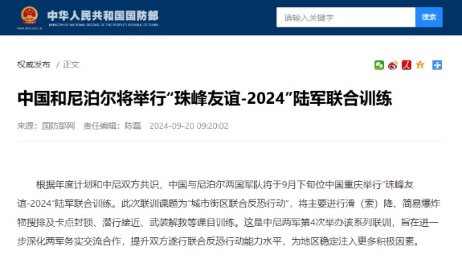 香港中通社9月22日電 中國和尼泊爾“珠峰友誼-2024”陸軍聯合訓練22日在中國重慶市某訓練基地舉行開訓儀式。這是繼2019年後,中尼兩軍時隔五年第4次舉行“珠峰”系列聯合訓練。
