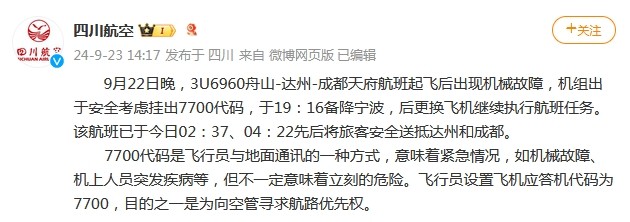 香港新聞網9月23日電 據四川航空股份有限公司官方微博消息,9月22日晚,3U6960舟山-達州-成都天府航班起飛後出現機械故障,機組出於安全考慮掛出7700代碼,於19:16備降寧波,後更換飛機繼續執行航班任務。該航班已於今日(23日)02:37、04:22先後將旅客安全送抵達州和成都。 7700代碼是飛行員與地面通訊的一種方式,意味著緊急情況,如機械故障、機上人員突發疾病等,但不一定意味著立刻的危險。飛行員設置飛機應答機代碼為7700,目的之一是為向空管尋求航路優先權。