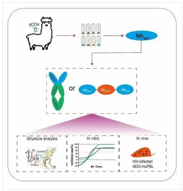 HIV中和納米抗體發現與工程改造(圖源:“南京大學”微信公眾號) 論文另一位共同通訊作者、南京大學醫學院研究員吳喜林介紹,在真病毒測試中,由Nb457工程化改造而來的三聚體納米抗體,對艾滋病病毒實現了強效抑制。在後期小鼠實驗中,為感染艾滋病病毒的小鼠注射三聚體納米抗體後,研究人員在小鼠體內幾乎檢測不到病毒,也沒有發現耐藥突變現象。 吳稚偉表示,艾滋病病毒變異速度快,容易產生耐藥性,導致藥效下降。此次發現的新抗體并不針對病毒本身,而是CD4這個“門把手”,因此不易導致病毒產生耐藥性,對艾滋病新藥研發和臨床治療具有重要啟發意義。(完) 【編輯:丘志彬】