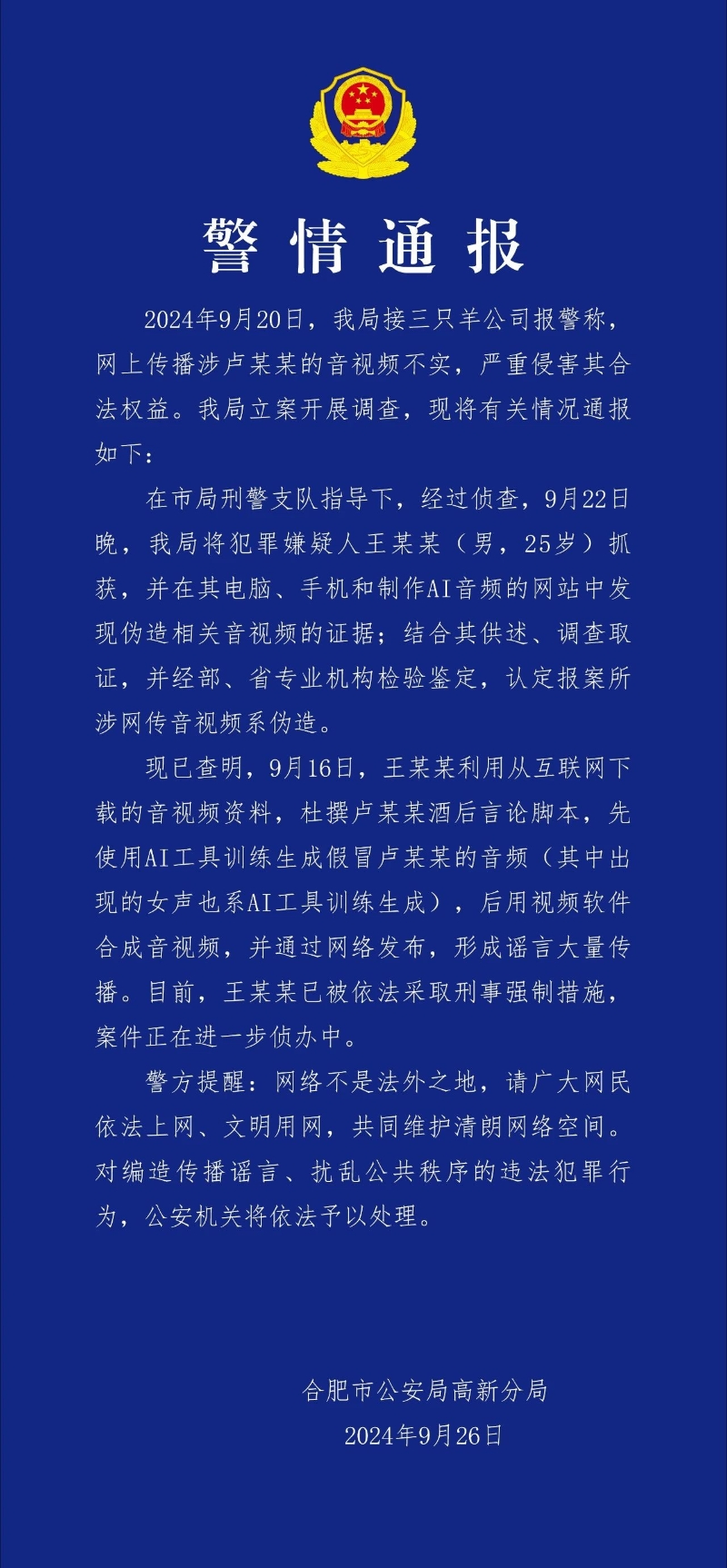香港中通社9月27日電 中國安徽省合肥市公安局高新分局26日晚通報,該局20日接三隻羊公司報警稱,網上傳播涉盧某某的音視頻不實,嚴重侵害其合法權益。經查,相關音視頻係AI偽造,嫌疑人已被依法採取刑事強制措施。 通報稱,經過偵查,22日晚,合肥市公安局高新分局將犯罪嫌疑人王某某(男,25歲)抓獲,並在其電腦、手機和製作AI音頻的網站中發現偽造相關音視頻的證據;結合其供述、調查取證,並經專業機構檢驗鑒定,認定報案所涉網傳音視頻係偽造。 現已查明,9月16日,王某某利用從互聯網下載的音視頻資料,杜撰盧某某酒後言論腳本,先使用AI工具訓練生成假冒盧某某的音頻(其中出現的女聲也係AI工具訓練生成),後用視頻軟件合成音視頻,並通過網絡發布,形成謠言大量傳播。目前,王某某已被依法採取刑事強制措施,案件正在進一步偵辦中。
